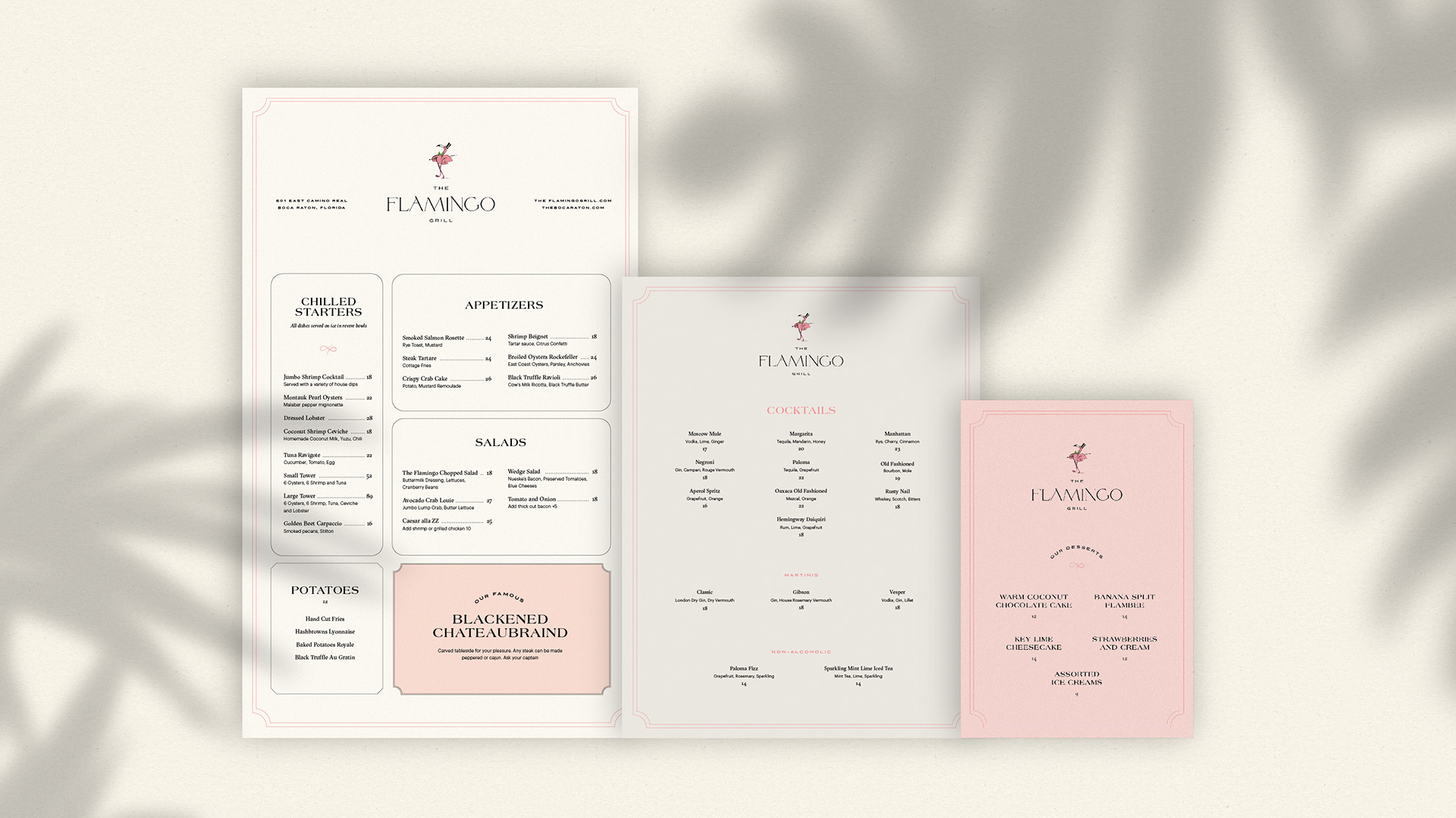 Evoking South Florida’s golden age, The Flamingo Grill invites guests to drink and dine in a timeless, social setting as charismatic service captains deliver an unparalleled culinary experience that is at once intimate and energetic. The brand comes to life through the personification of Gregarious Greg, a long time regular and highly social flamingo. King & Partners collaborated with Tug Rice for the custom illustration. In collaboration with Major Food Groups and located at The Boca Raton. Photographer: Patrick Michael Chin